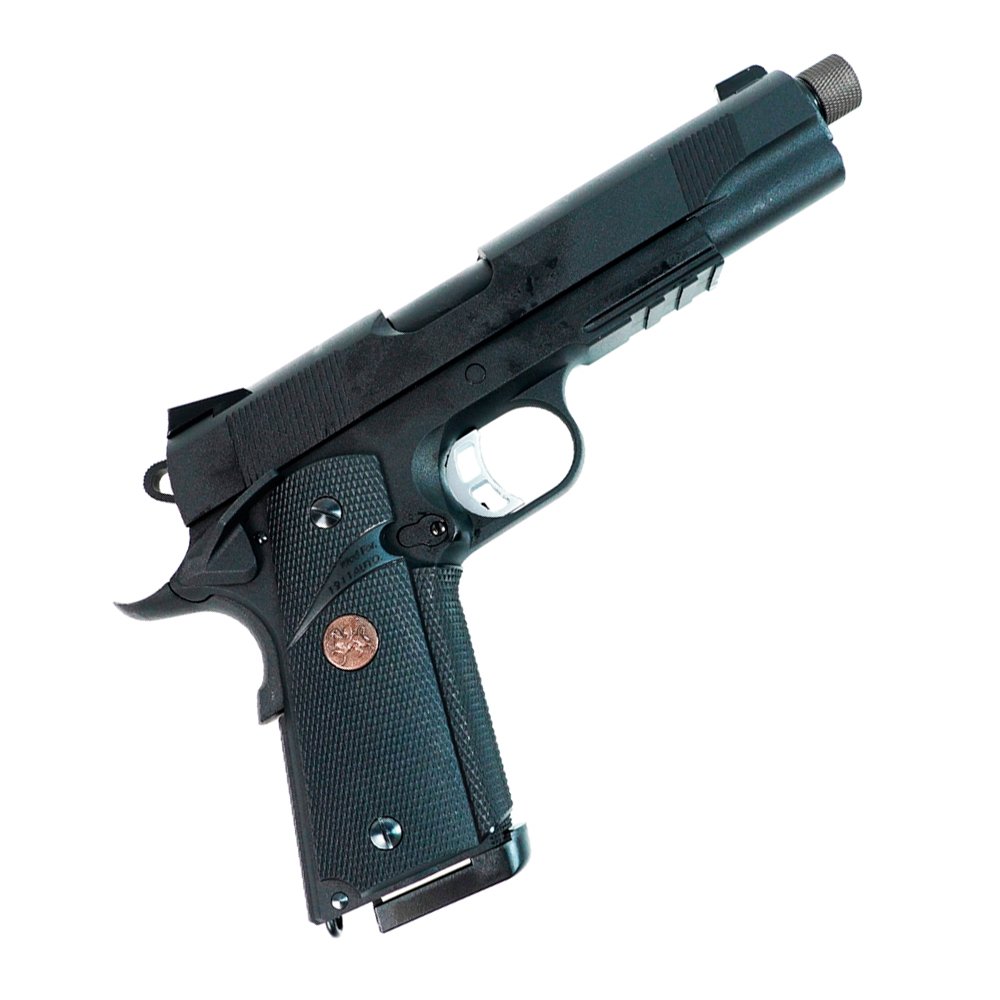 Colt M1911 MEU от производителя KJWORKS, точная страйкбольная модель основанная на модели пистолета Colt-Browning M1911. На пистолете есть установленная резьба для установки глушителя или трассерной насадки.