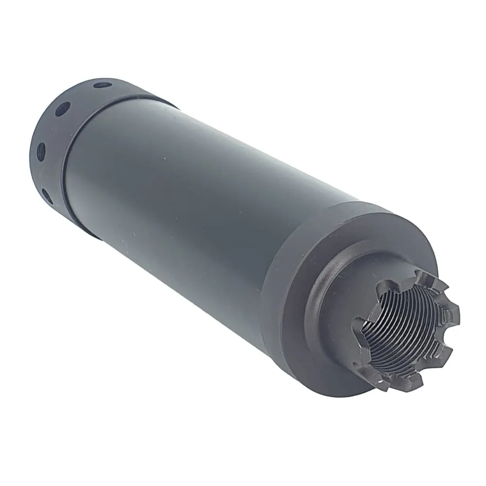 Страйкбольный глушитель Путник от изготовителя Мастерская Дайса изготовлен из легкого и прочного алюминиевого сплава марки д16т с анодированным покрытием. Резьба 24мм+ для установки на страйкбольные модели. Внутри полый, разборной, можно установить удлинитель стволика или трассерный блок.