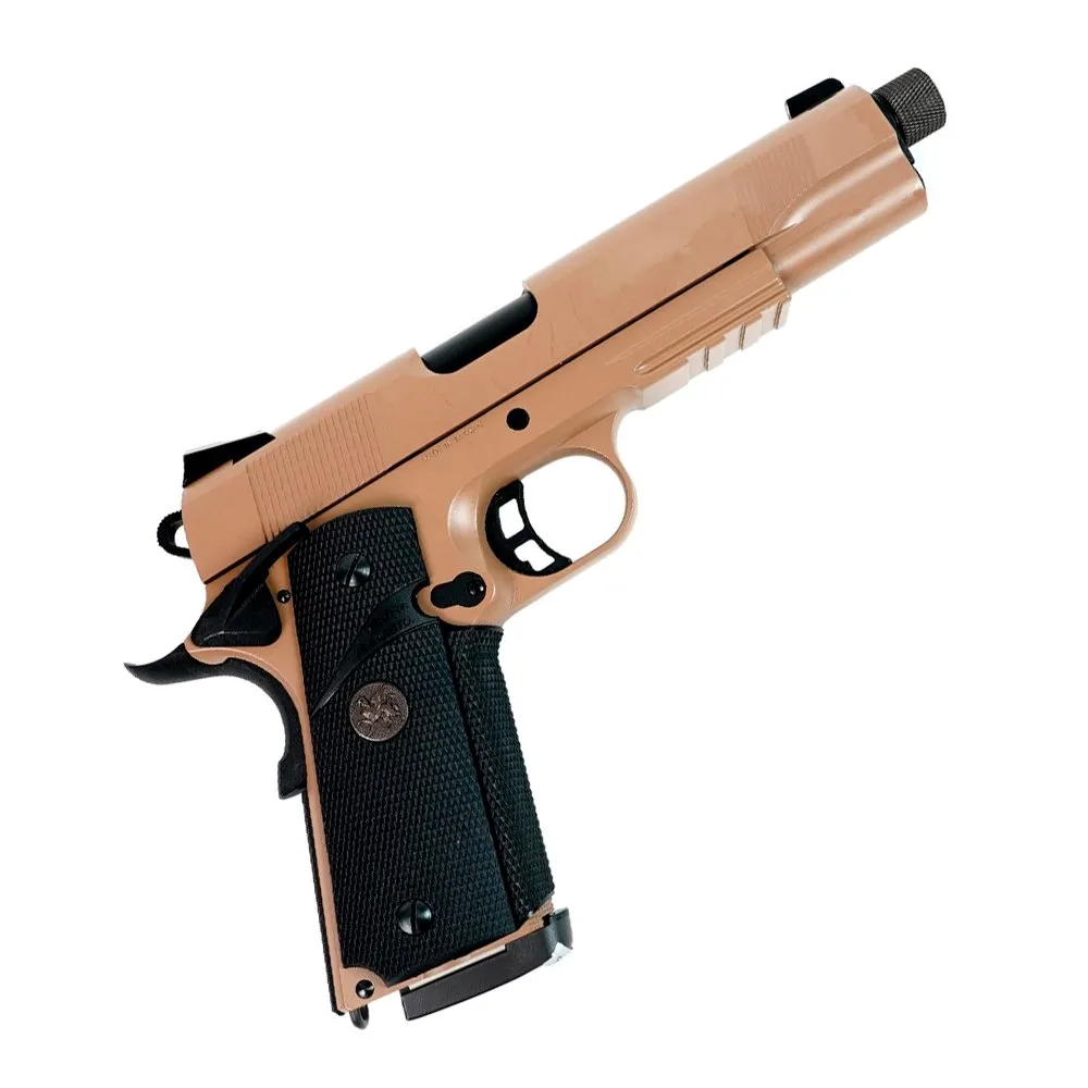 Colt M1911 MEU от производителя KJWORKS, точная страйкбольная модель основанная на модели пистолета Colt-Browning M1911. На пистолете есть установленная резьба для установки глушителя или трассерной насадки. Выполнен в цвете Тан.